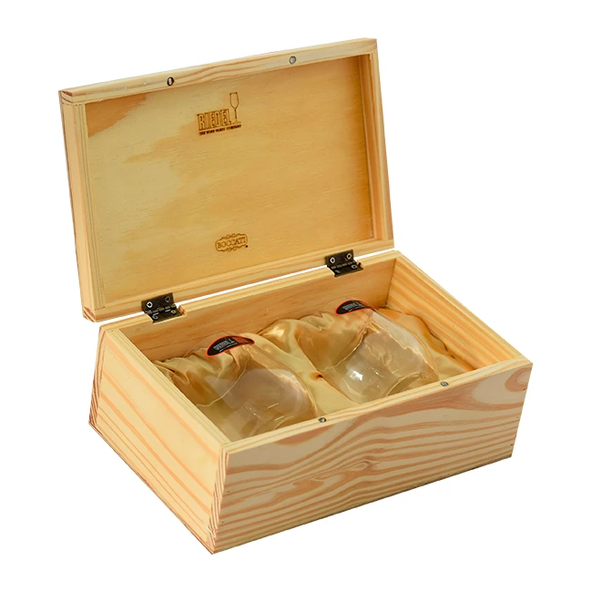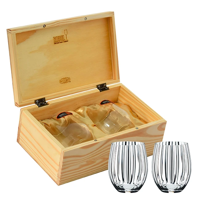 Caixa de madeira para presente contendo 2 copos Tumbler Optical Longdrink 580ml, combina design moderno e funcionalidade, proporcionando uma experiência de degustação única para suas bebidas favoritas.